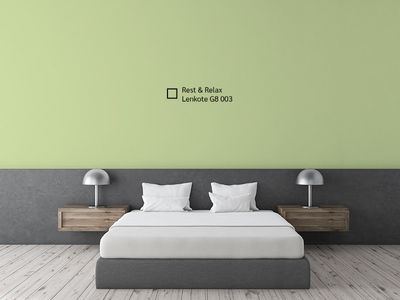 Suasana kamar tidur yang baik hendaknya mampu mendorong kualitas istirahat kita. Warna Rest & Relax (Lenkote G8 003) yang teduh dapat menjadi pelepas penat setelah sibuk dengan pekerjaan dan aktivitas rutin. Penggunaan Cat Tembok Supersilk Anti Noda di kamar tidur sangat dianjurkan terutama bagi kamar anak yang sedang dalam masa aktif berkreasi.