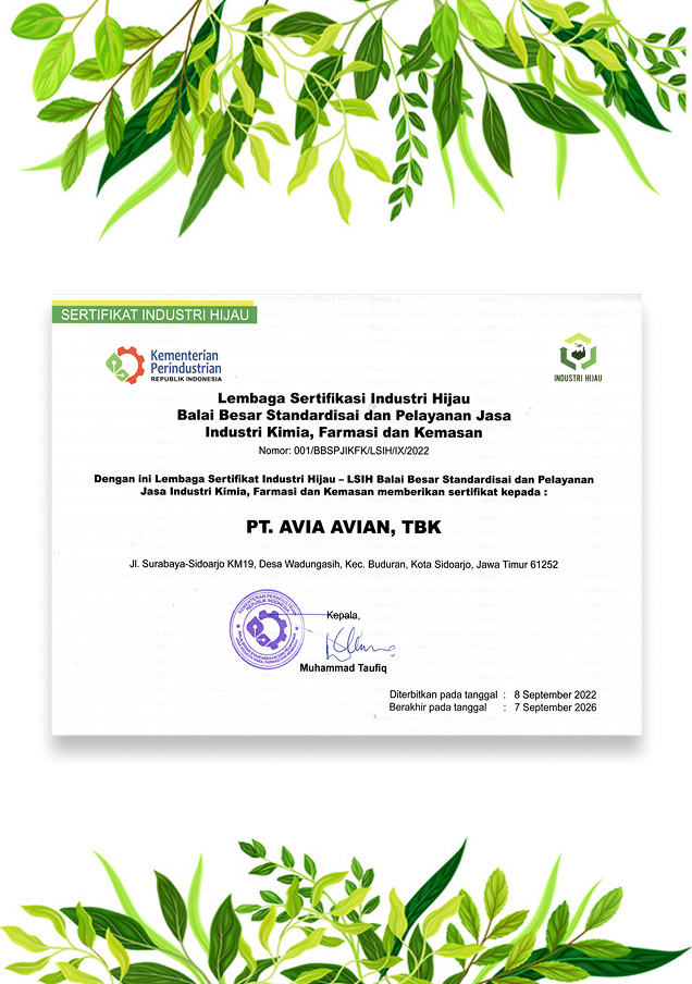 Sertifikasi yang diberikan oleh Kementerian Perindustrian untuk PT Avia Avian Tbk dari tahun 2022 dan berlaku hingga 2026 yang menunjukkan bahwa perusahaan telah menerapkan prinsip industri hijau.
