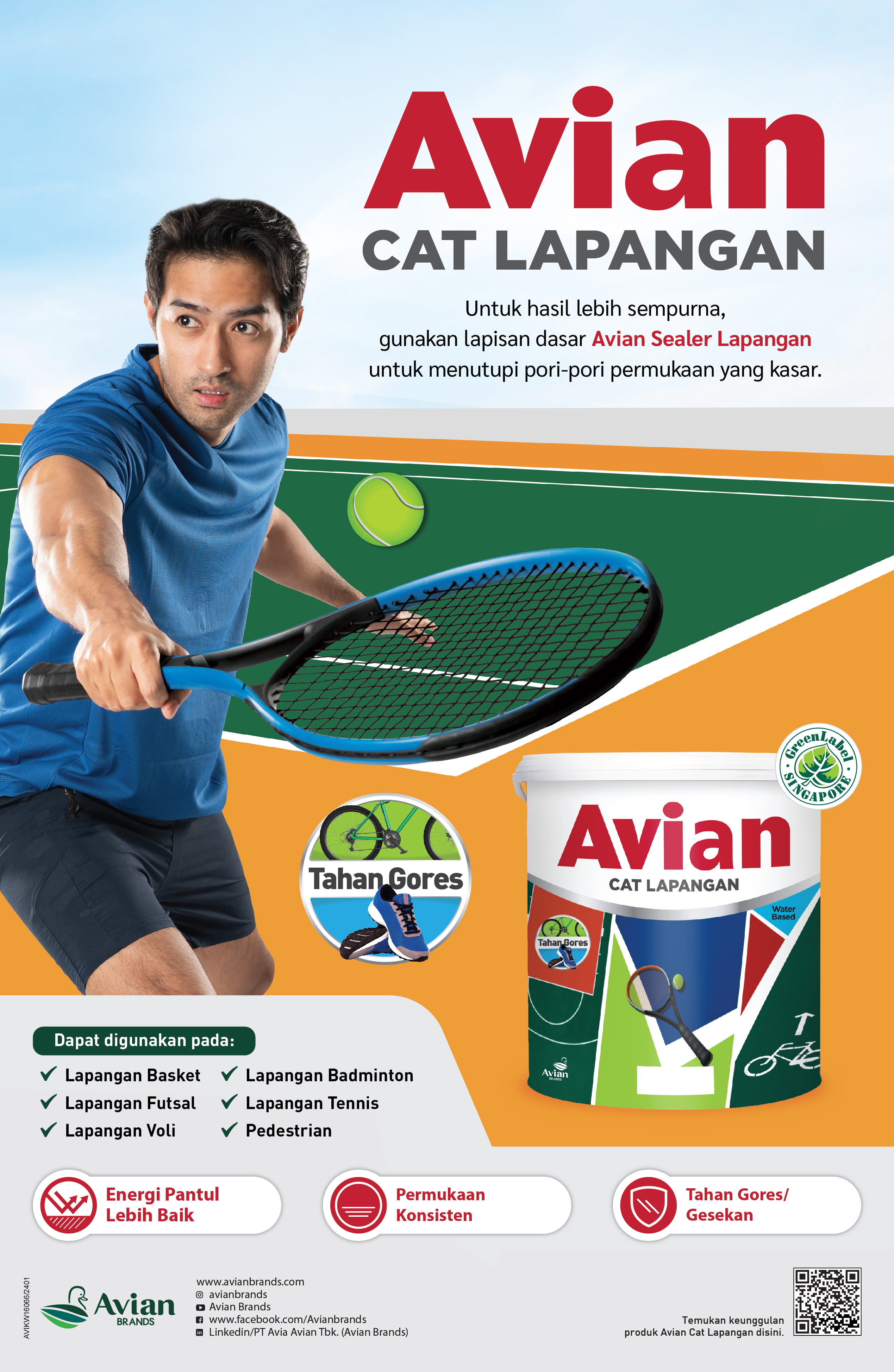 Avian Cat Lapangan adalah cat lantai serba guna, baik untuk di dalam maupun diluar ruangan dan dapat diaplikasikan untuk lapangan olahraga, lapangan parkir, cat jalan, paving, heliport serta segala macam jenis permukaan lantai yang terbuat dari semen dan beton. Avian Cat Lapangan ini dilengkapi dengan pasir silika yang berwarna putih, sehingga apabila dicampurkan pada catnya, akan memiliki keunggulan anti selip, tahan gores/ gesekan serta memiliki daya lekat yang sangat baik, sehingga bisa juga diaplikasikan pada permukaan asbes maupun seng. Avian Cat Lapangan memiliki tampilan warna-warna yang indah serta memliki ketahanan yang sangat baik terhadap cuaca.